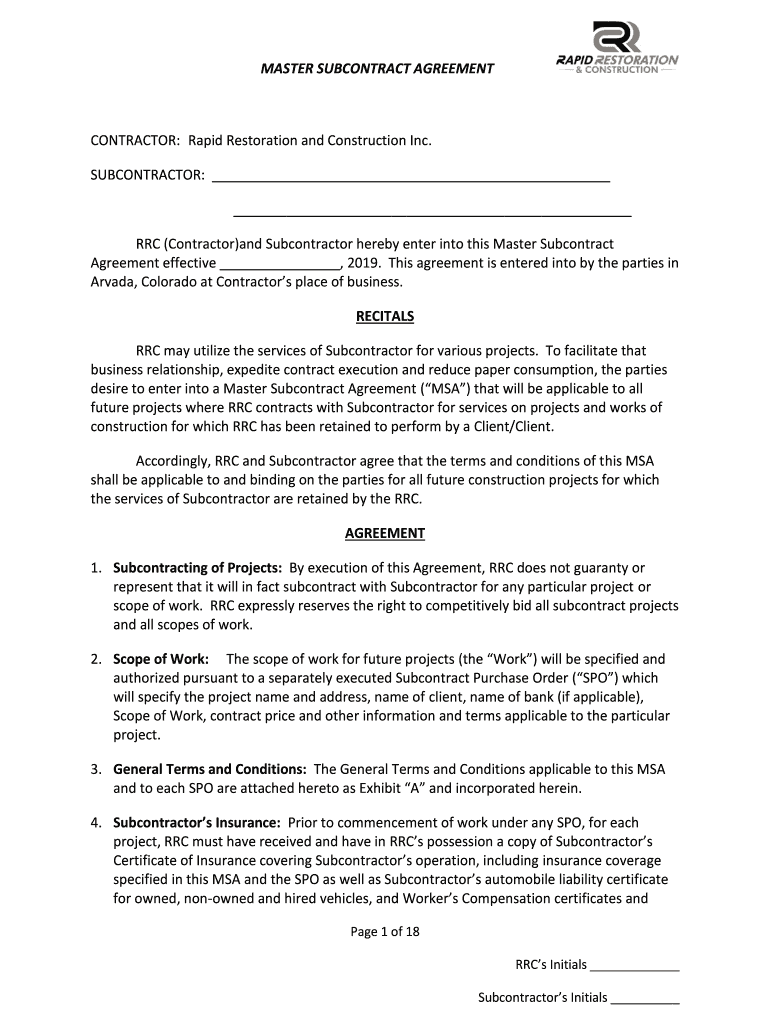 MASTER SUBCONTRACT AGREEMENTCONTRACTOR: Rapid Restoration and Construction Inc. SUBCONTRACTOR: RRC (Contractor)and Subcontractor hereby enter into this Master Subcontract Agreement effective, 2019.