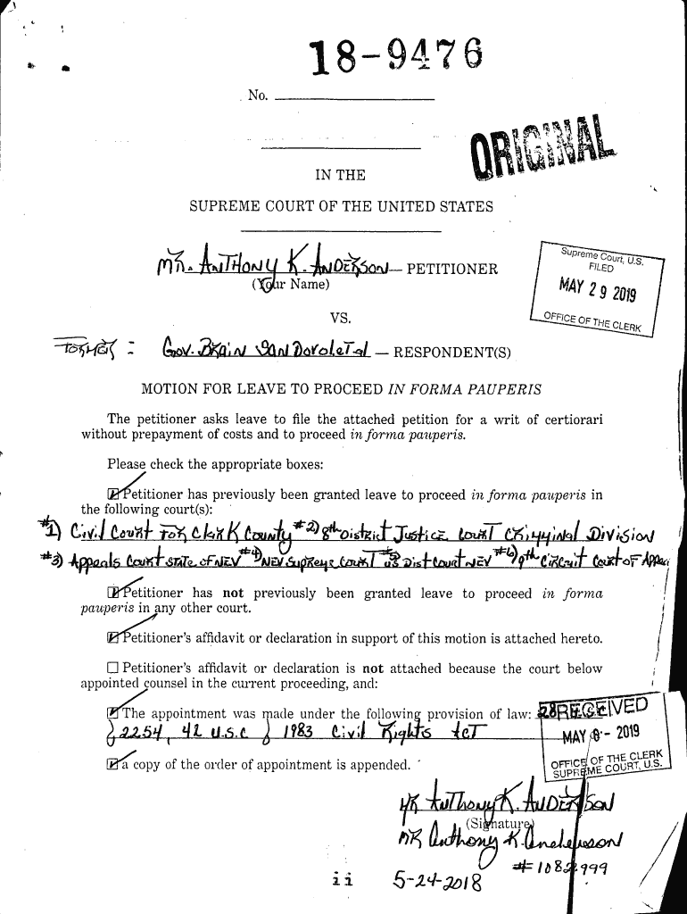 No. 189476IIIN THE11SUPREME COURT OF THE UNITED STATESJ1IOJ ADR PETITIONERFILED Irma 29 2079Name) Vs.1, 3×I o601J4RESPONDENT(S)MOTION FOR LEAVE TO PROCEED IN FORM PAUPERS The petitioner asks leave