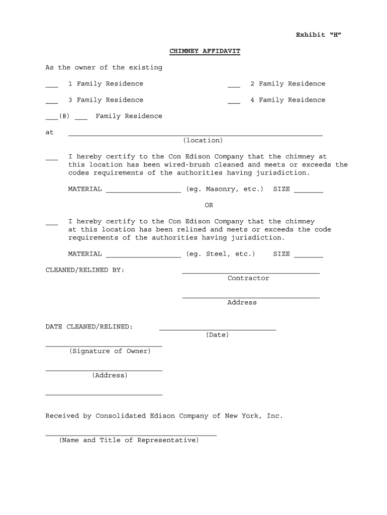 Exhibit H CHIMNEY AFFIDAVIT As the owner of the existing 1 Family Residence 2 Family Residence 3 Family Residence 4 Family Residence (#) Family Residence at (location) I hereby certify to the Con