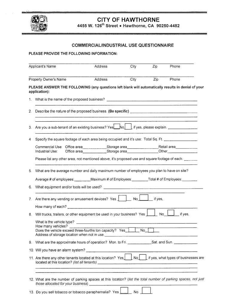 CITY OF HAWTHORNE 4455 W. 125th Street Hawthorne, CA 902504482COMMERCIAUINDUSTRIAL USE QUESTIONNAIRE PLEASE PROVIDE THE FOLLOWING INFORMATION:Applicant's NameAddressCityZipPhoneProperty Owner's NameAddressCityZipPhonePLEASE