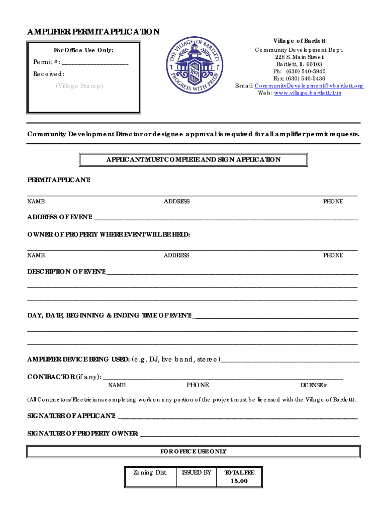 AMPLIFIER PERMIT APPLICATIONVillage of Bartlett Office Use Only:Community Development Dept. 228 S. Main Street Bartlett, IL 60103 pH: (630) 5405940 Fax: (630) 5405436 Email: CommunityDevelopment Bartlett.org