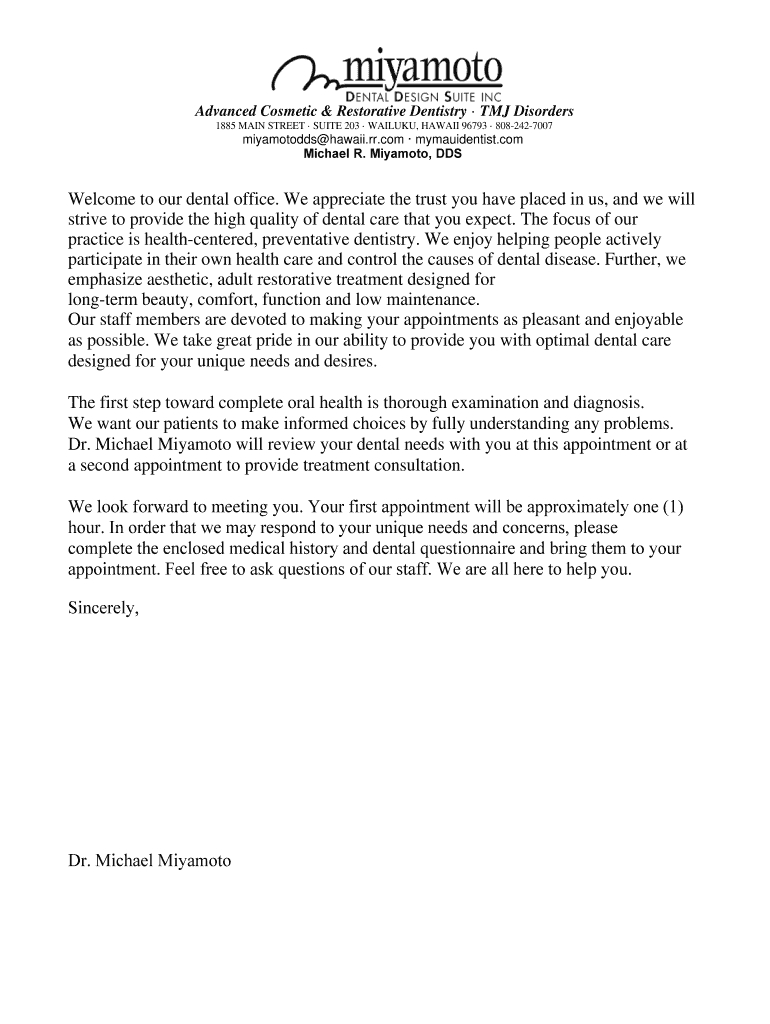 Advanced Cosmetic & Restorative Dentistry TMJ Disorders 1885 MAIN STREET SUITE 203 WAILUKU, HAWAII 96793 8082427007miyamotodds Hawaii.rr.com mymauidentist.com Michael R. Miyamoto, Welcome to our dental