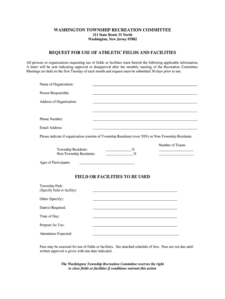 WASHINGTON TOWNSHIP RECREATION COMMITTEE 211 State Route 31 North Washington, New Jersey 07882REQUEST FOR USE OF ATHLETIC FIELDS AND FACILITIES All persons or organizations requesting use of fields