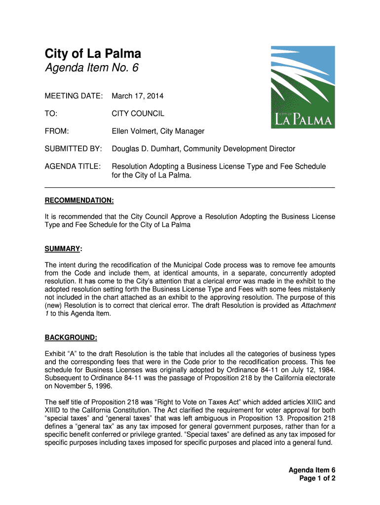 City of La Palma Agenda Item No. 6 MEETING DATE:March 17, 2014TO:CITY COUNCILOR:Ellen Colbert, City ManagerSUBMITTED BY:Douglas D. Chart, Community Development DirectorAGENDA TITLE:Resolution Adopting