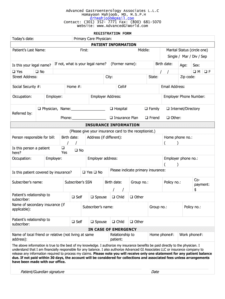 Advanced Gastroenterology Associates L.L.C Honeymoon Mahjong, MD, M.S.P.H drhmahjoob gmail.com Contact: (301) 352 7771 Fax: (800) 6815070 Website: www.AdvancedGiWorld.com REGISTRATION FORM Primary