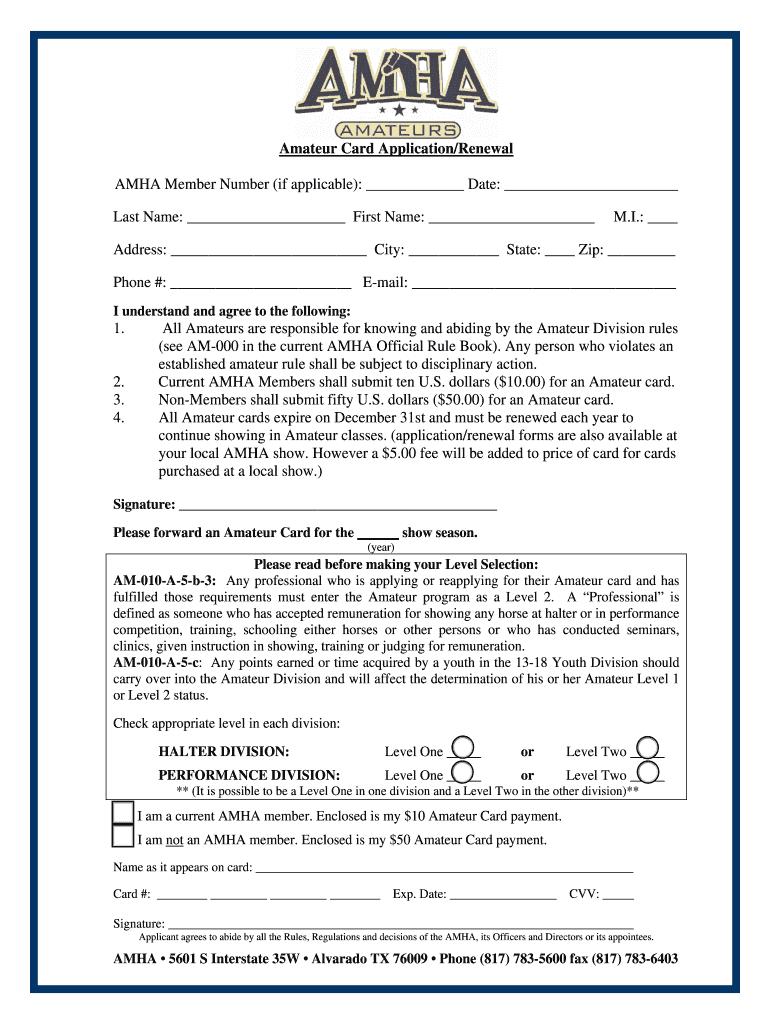 Amateur Card Application/Renewal AMHA Member Number (if applicable): Date: Last Name: First Name: M.I.: Address: City: State: Zip: Phone #: Email: I understand and agree to the following:1.2. 3. 4.