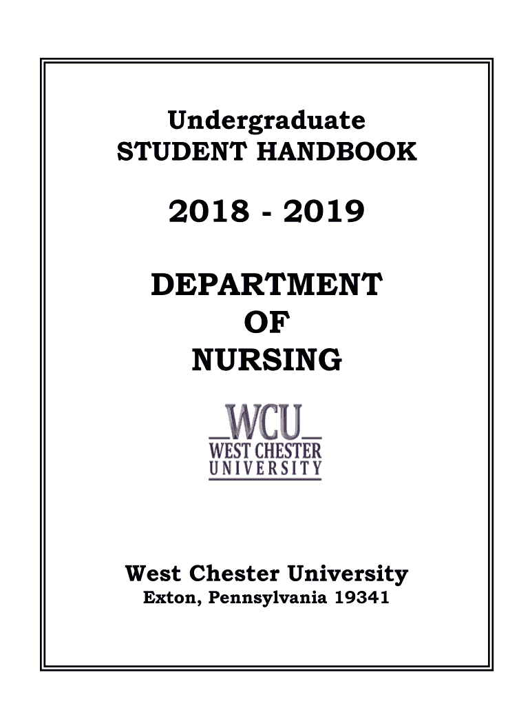 Undergraduate STUDENT HANDBOOK2018 2019 DEPARTMENT OF NURSING West Chester University Eaton, Pennsylvania 19341STUDENT HANDBOOK×PUBLISHED August 2018 DEPARTMENT OF NURSING WEST CHESTER UNIVERSITY