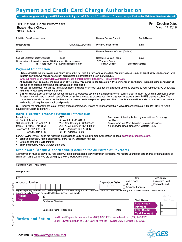 Payment and Credit Card Charge Authorization All orders are governed by the GES Payment Policy and GES Terms & Conditions of Contract as specified in this Exhibitor Services Manual. Form Deadline