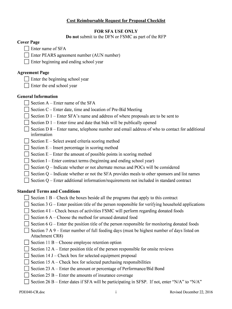 Cost Reimbursable Request for Proposal Checklist FOR SFA USE ONLY Do not submit to the DFN or USMC as part of the RFP Cover Page Enter name of SFA Enter PEARS agreement number (AUN number) Enter beginning