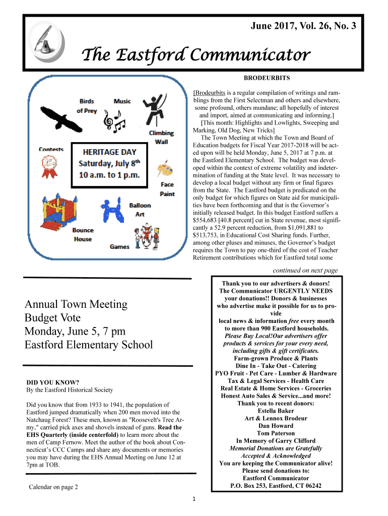 June 2017, Vol. 26, No. 3The East ford Communicator BRODEURBITS is a regular compilation of writings and ramblings from the First Selectman and others and elsewhere, some profound, others mundane;