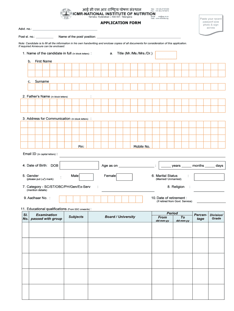 Paste your recent passport size photo & sign acrossAPPLICATION FORM Advt. No.: Post SL. no.: Name of the post/ position: Note: Candidate is to fill all the information in his own handwriting and enclose