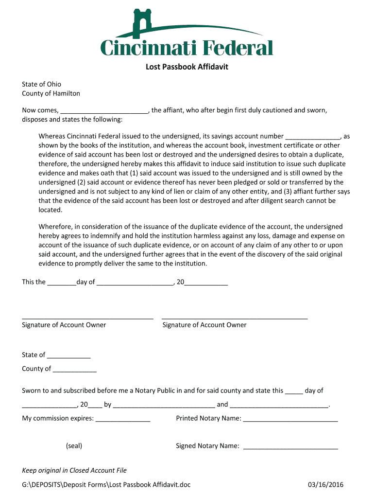 Lost Passbook Affidavit State of Ohio County of Hamilton Now comes, the affine, who after begin first duly cautioned and sworn, disposes and states the following: Whereas Cincinnati Federal issued