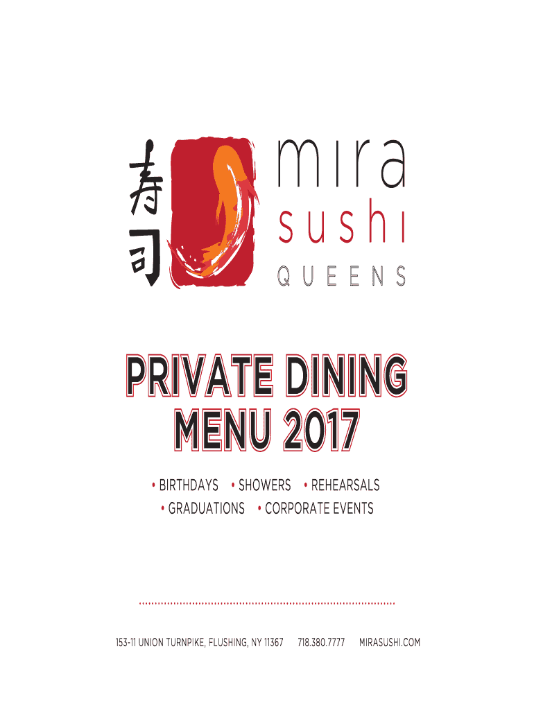 PRIVATE DINING MENU 2017 BIRTHDAYS SHOWERS REHEARSALS GRADUATIONS CORPORATE EVENTS15311 UNION TURNPIKE, FLUSHING, NY 11367718.380.7777MIRASUSHI.ABOUT UNWELCOME TO MIRA SUSHI QUEENS. We are committed