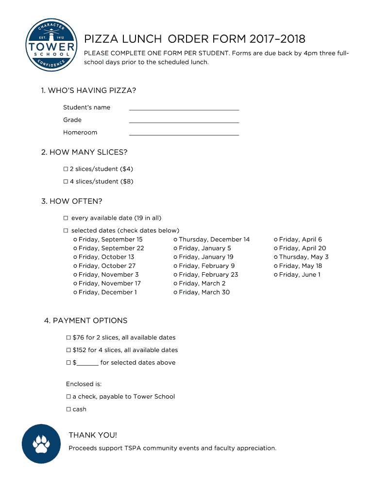 PIZZA LUNCH ORDER FORM 20172018 PLEASE COMPLETE ONE FORM PER STUDENT. Forms are due back by 4pm three full school days prior to the scheduled lunch. 1. WHO'S HAVING PIZZA? Students name Grade Homeroom