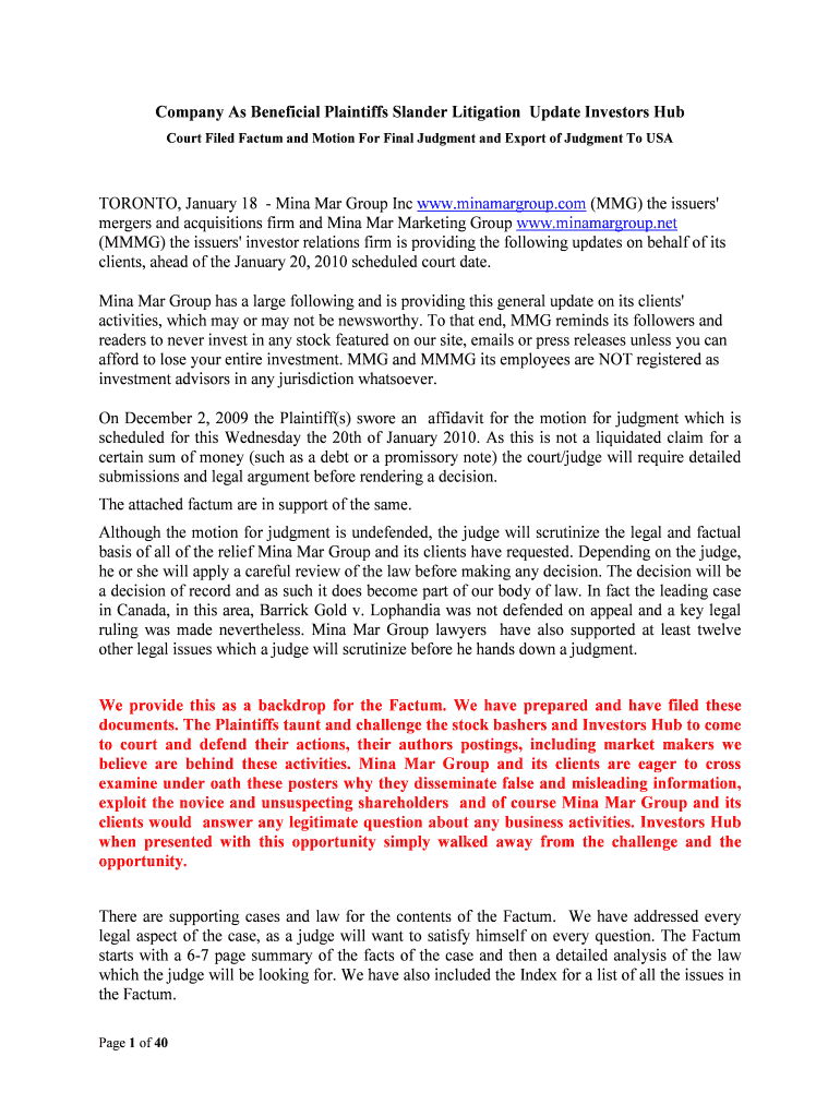 Company As Beneficial Plaintiffs Slander Litigation Update Investors Hub Court Filed Factum and Motion For Final Judgment and Export of Judgment To TORONTO, January 18 Mind Mar Group Inc www.minamargroup.com