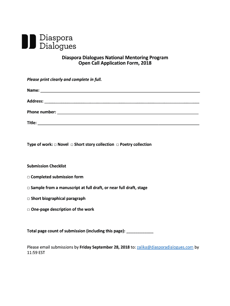 Diaspora Dialogues National Mentoring Program Open Call Application Form, 2018 Please print clearly and complete in full. Name: Address: Phone number: Title: Type of work: Novel Short story collection