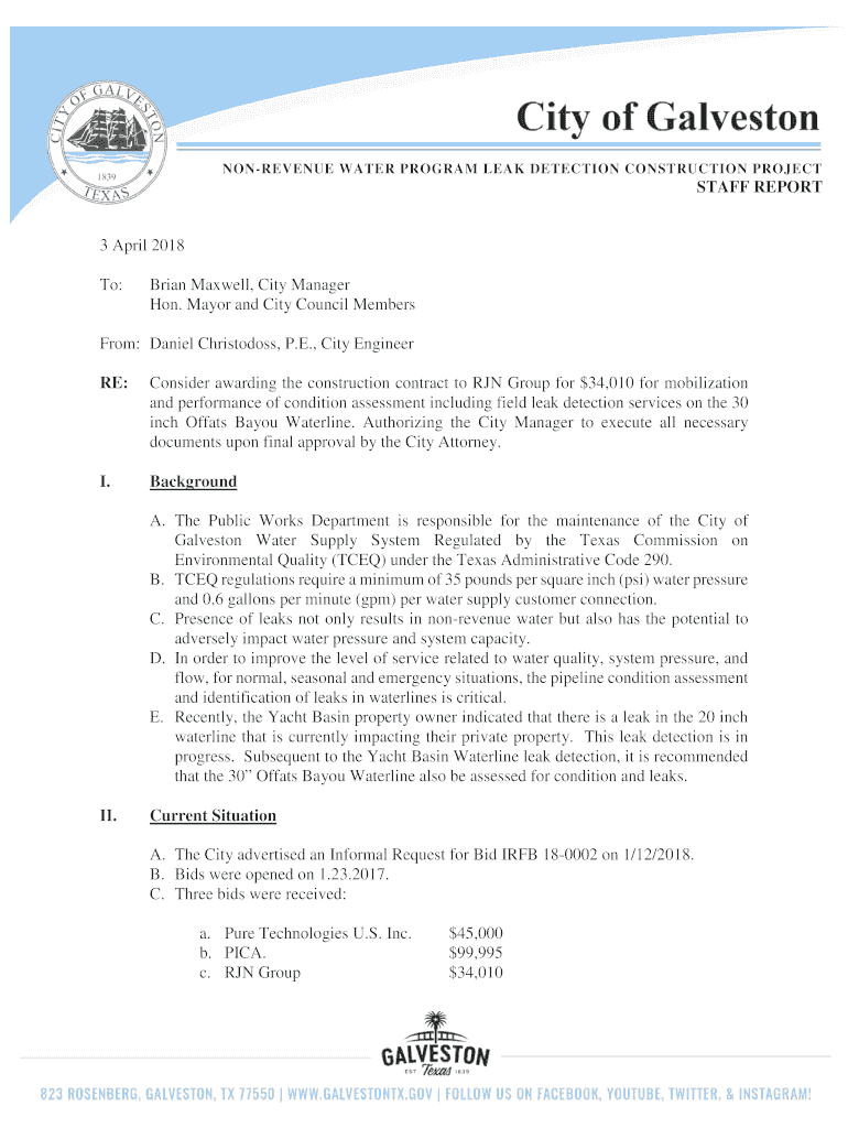 REVENUE WATER PROGRAM LEAK DETECTION CONSTRUCTION PROJECTSTAFF REPORT3 April 2018 To:Brian Maxwell, City Manager Hon. Mayor and City Council MembersFrom: Daniel Christology, P.E., City Engineer RE:Consider