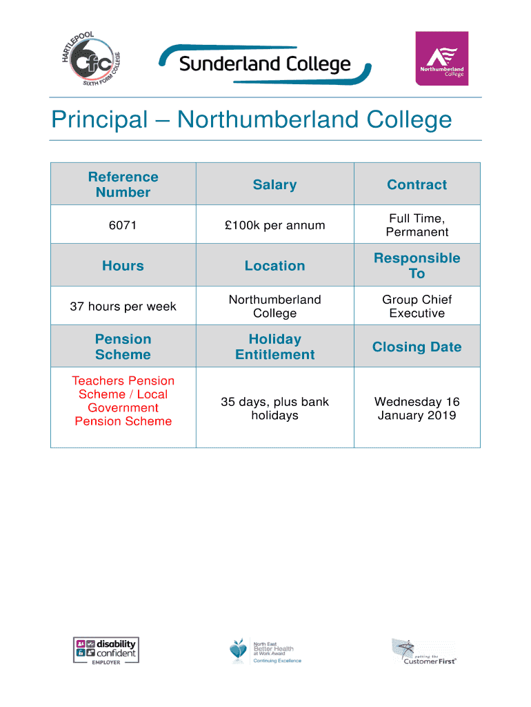 Principal Northumberland College Reference NumberSalaryContract6071100k per annumFull Time, PermanentHoursLocationResponsible To37 hours per weekNorthumberland CollegeGroup Chief ExecutivePension