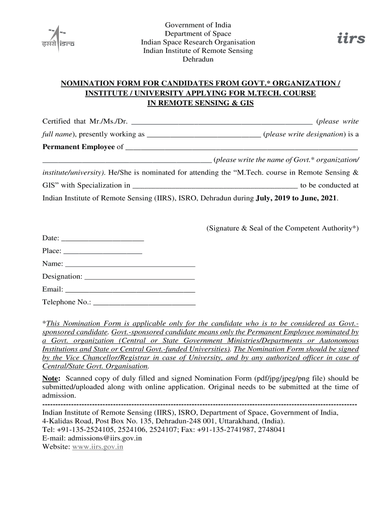 Government of India Department of Space Indian Space Research Organization Indian Institute of Remote Sensing Dehradun NOMINATION FORM FOR CANDIDATES FROM GOVT.* Organization / INSTITUTE / UNIVERSITY