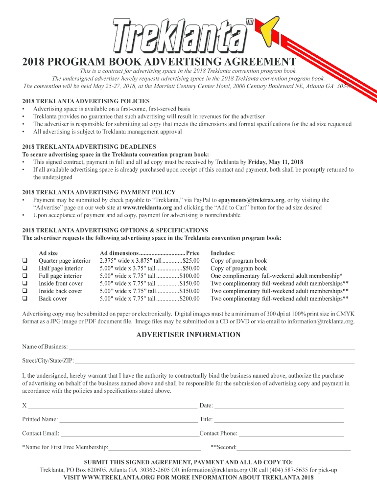 2018 PROGRAM BOOK ADVERTISING Agreements is a contract for advertising space in the 2018 Treblinka convention program book.