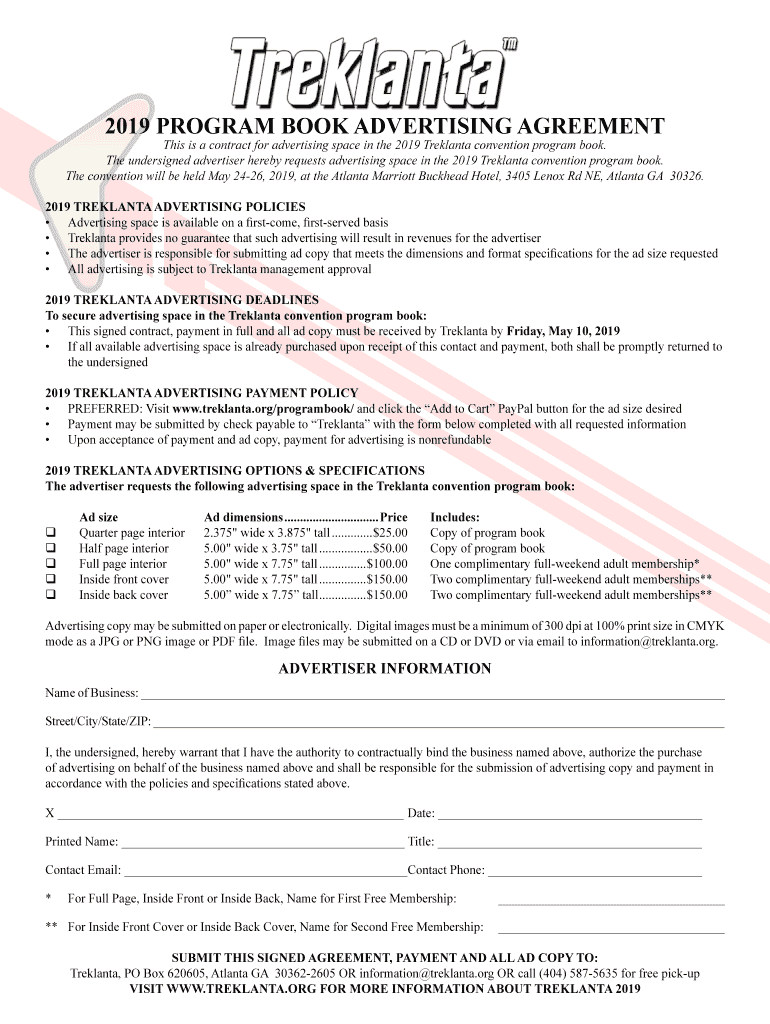 2019 PROGRAM BOOK ADVERTISING Agreements is a contract for advertising space in the 2019 Treblinka convention program book.