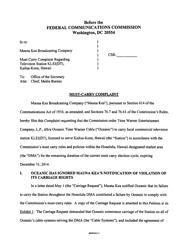 Before the FEDERAL COMMUNICATIONS COMMISSION Washington, DC 20554 In re: Fauna KEA Broadcasting Company Miscarry Complaint Regarding Television Station KLEIN(DT), KailuaKona, Hawaii To: Attn:)))))))CSR