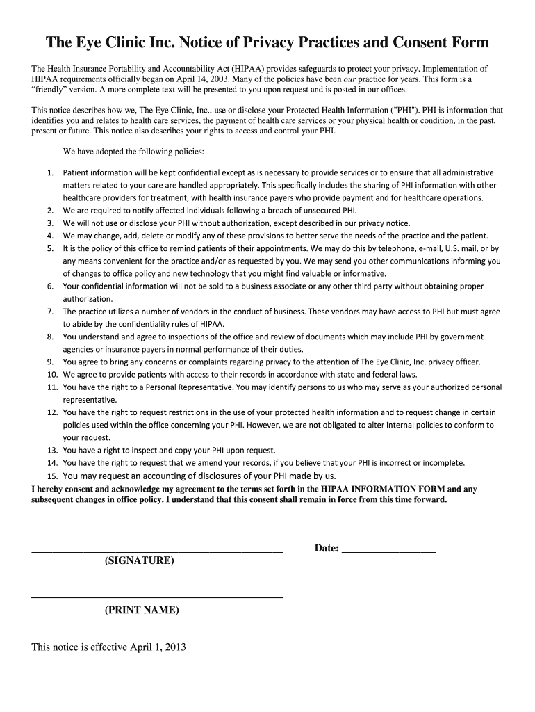 The Eye Clinic Inc. Notice of Privacy Practices and Consent Form The Health Insurance Portability and Accountability Act (HIPAA) provides safeguards to protect your privacy. Implementation of HIPAA