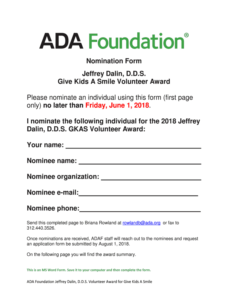 Get the free Nomination Form Jeffrey Dalin, DDS Give Kids A Smile Volunteer Award