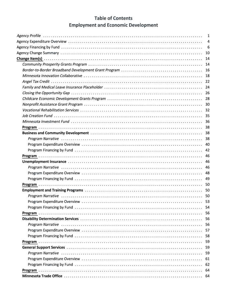 Table of Contents Employment and Economic Development Agency Profile. . . . . . . . . . . . . . . . . . . . . . . . . . . . . . . . . . . . . . . . . . . . . . . . . . . . . . . . . . . . . . . .