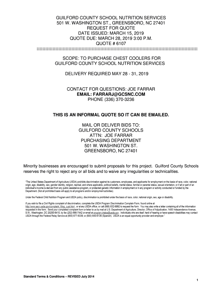 GUILFORD COUNTY SCHOOL NUTRITION SERVICES 501 W. WASHINGTON ST., GREENSBORO, NC 27401 REQUEST FOR QUOTE DATE ISSUED: MARCH 15, 2019, QUOTE DUE: MARCH 28, 2019 3:00 P.M. QUOTE # 6107 :::::::::::::::::::::::::::::::::::::::::::::::::::::::::::::::::::::::::::::::::::::::::::::::::::::::::::::::