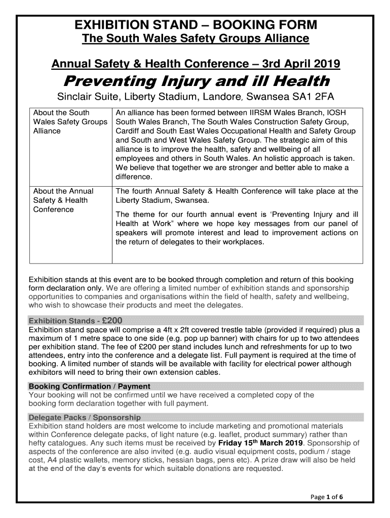 EXHIBITION STAND BOOKING FORM The South Wales Safety Groups Alliance Annual Safety & Health Conference 3rd April 2019Preventing Injury and ill Health Sinclair Suite, Liberty Stadium, Land ore, Swansea