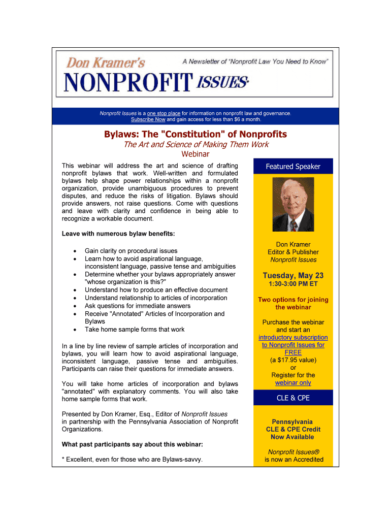 Nonprofit Issues is a one-stop place for information on nonprofit law and governance. Subscribe Now and gain access for less than $6 a month. Bylaws: The “Constitution of Nonprofits The Art and