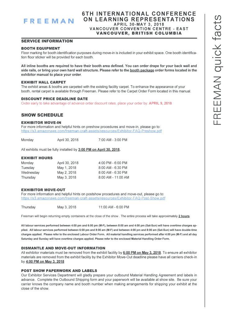 APRIL 30MAY 3, 2018 VANCOUVER CONVENTION Center EAST VANCOUVER, BRITISH COLUMBIASERVICE INFORMATION BOOTH EQUIPMENT Floor marking for booth identification purposes during Moran is included in your