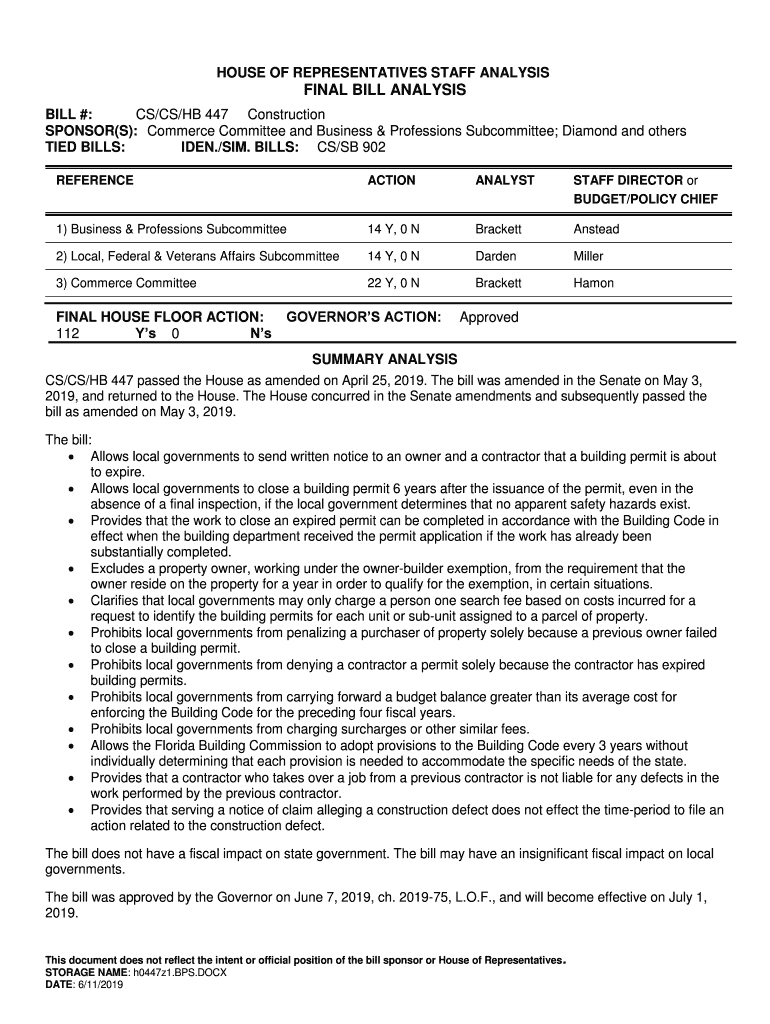 HOUSE OF REPRESENTATIVES STAFF ANALYSISFINAL BILL ANALYSIS BILL #: CS/CS/HE 447 Construction SPONSOR(S): Commerce Committee and Business & Professions Subcommittee; Diamond and others TIED BILLS: