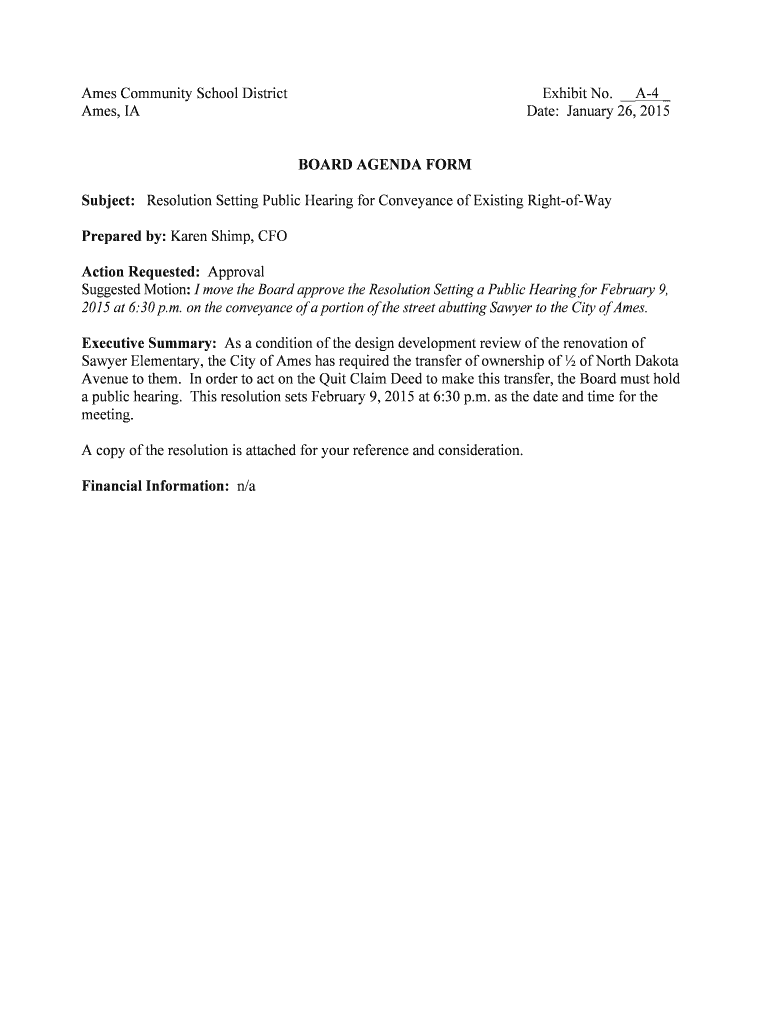 Ames Community School District Ames, Exhibit No. A4 Date: January 26, 2015, BOARD AGENDA FORMSubject: Resolution Setting Public Hearing for Conveyance of Existing RightofWay Prepared by: Karen Ship,