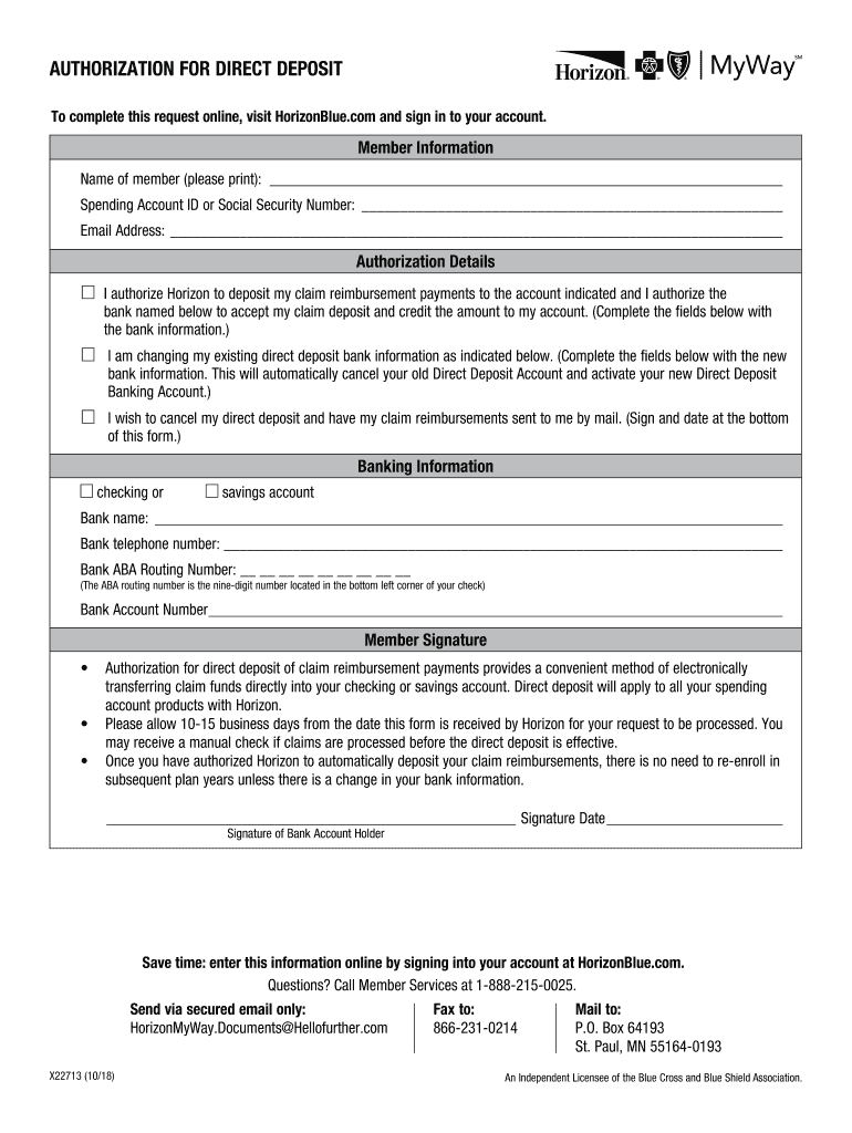 AUTHORIZATION FOR DIRECT DEPOSIT To complete this request online, visit HorizonBlue.com and sign in to your account. Member Information Name of member (please print): Spending Account ID or Social