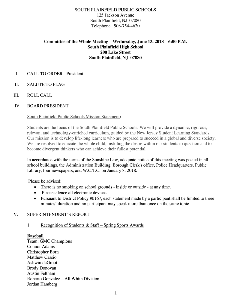 SOUTH PLAINFIELD PUBLIC SCHOOLS 125 Jackson Avenue South Plainfield, NJ 07080 Telephone: 9087544620 Committee of the Whole Meeting Wednesday, June 13, 2018 6:00 P.M. South Plainfield High School 200