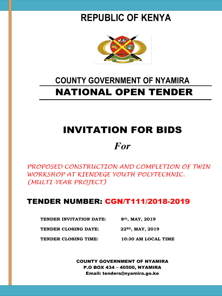 REPUBLIC OF KENYACOUNTY GOVERNMENT OF NYAMIRANATIONAL OPEN TENDERINVITATION FOR Bishop PROPOSED CONSTRUCTION AND COMPLETION OF TWIN WORKSHOP AT VIENNESE YOUTH POLYTECHNIC. (MULTIYEAR PROJECT)TENDER