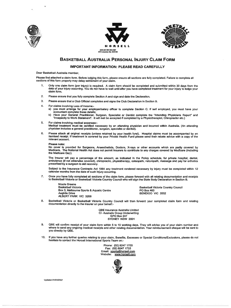 11, g, r. , “HORSE LL re “, 9009,22 “, Aisle. , “o89.30BASKETBALLAUSTRALIA PERSONALINJURYCLAIM FORM IMPORTANTINFORMATION: PLEASEREADCAREFULLY Dear BaskelballAustralia member. Please find attached