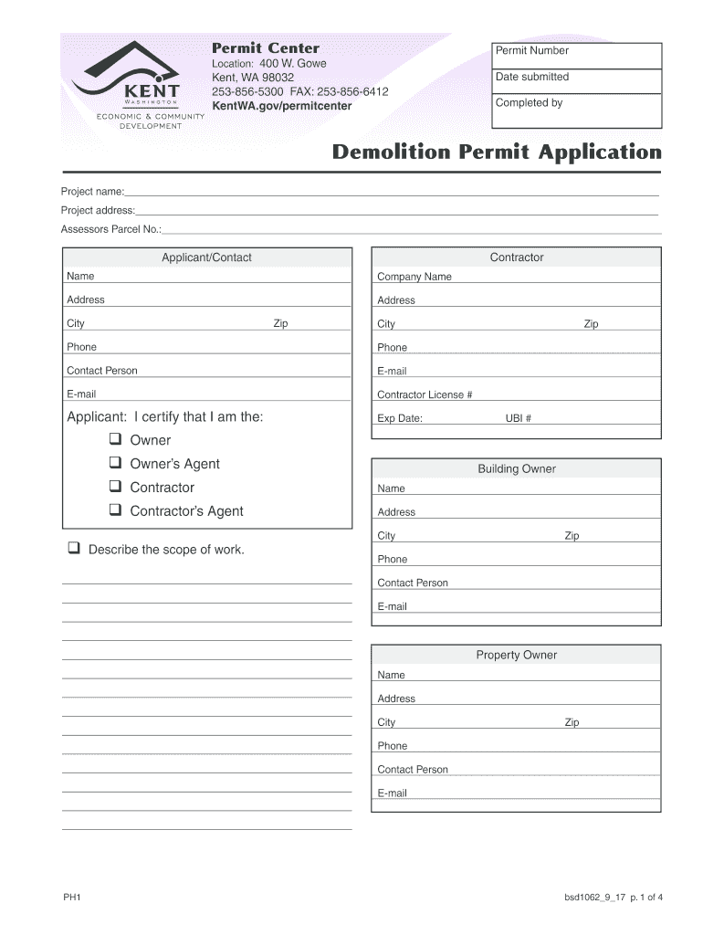 Permit CenterPermit Number Kent, WA 98032 2538565300 Faxes: 2538566412 KentWA.gov/permitcenterDate submittedLocation: 400 W. GoweCompleted demolition Permit Application Project name: Project address: