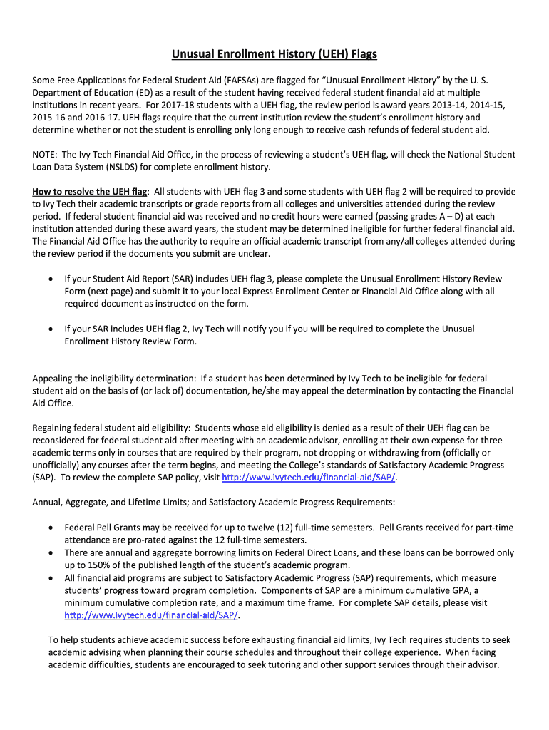 UnusualEnrollmentHistory(UE)Flags SomeFreeApplicationsforFederalStudentAid(FAFSAs)areflaggedforUnusualEnrollmentHistorybytheU. S. DepartmentofEducation(ED)asaresultofthestudenthavingreceivedfederalstudentfinancialaidatmultiple