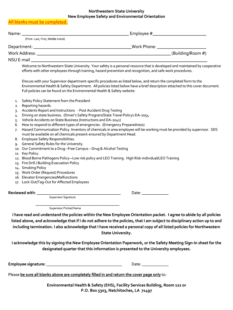 Northwestern State University New Employee Safety and Environmental Orientation blanks must be completed. Name: Employee # (Print Last, First, Middle Initial)Department: Work Phone: Work Address: