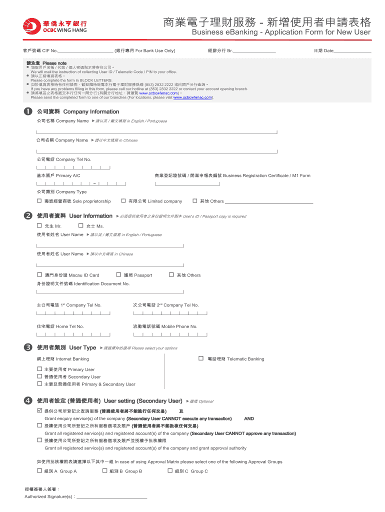 Business banking Application Form for New User CIF No. (For Bank Use Only) Please note Br. / / We will mail the instruction of collecting User ID / Telematics Code / PIN to your office. Please complete