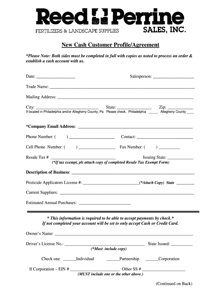 New Cash Customer Profile/Agreement *Please Note: Both sides must be completed in full of copies as noted to process an order & establish a cash account with us. Date: Salesperson: Trade Name: Mailing