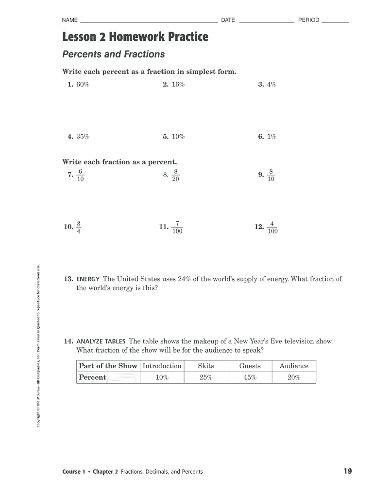 NAME DATE PERIOD Lesson 2 Homework Practice Percents and Fractions Write each percent as a fraction in the simplest form. 1. 60×2. 16×3. 4×4. 35×5. 10×6. 1×Write each fraction as a percent.