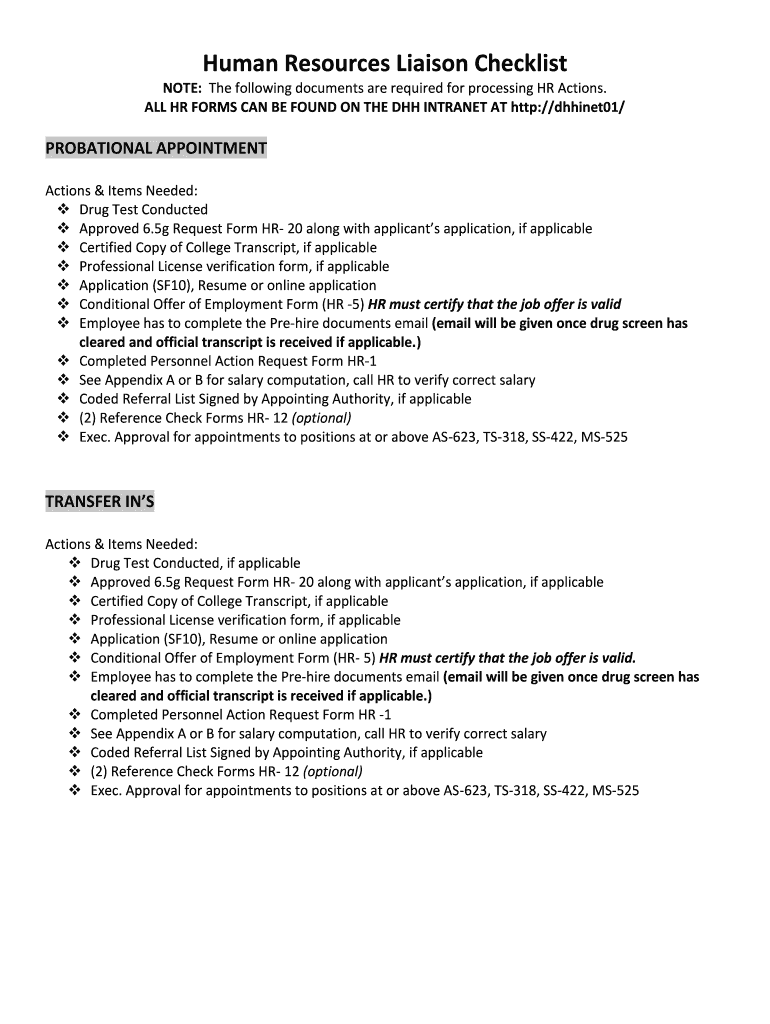 Human Resources Liaison Checklist NOTE: The following documents are required for processing HR Actions. ALL HR FORMS CAN BE FOUND ON THE DHH INTRANET AT http://dhhinet01/PROBATIONAL APPOINTMENT Actions