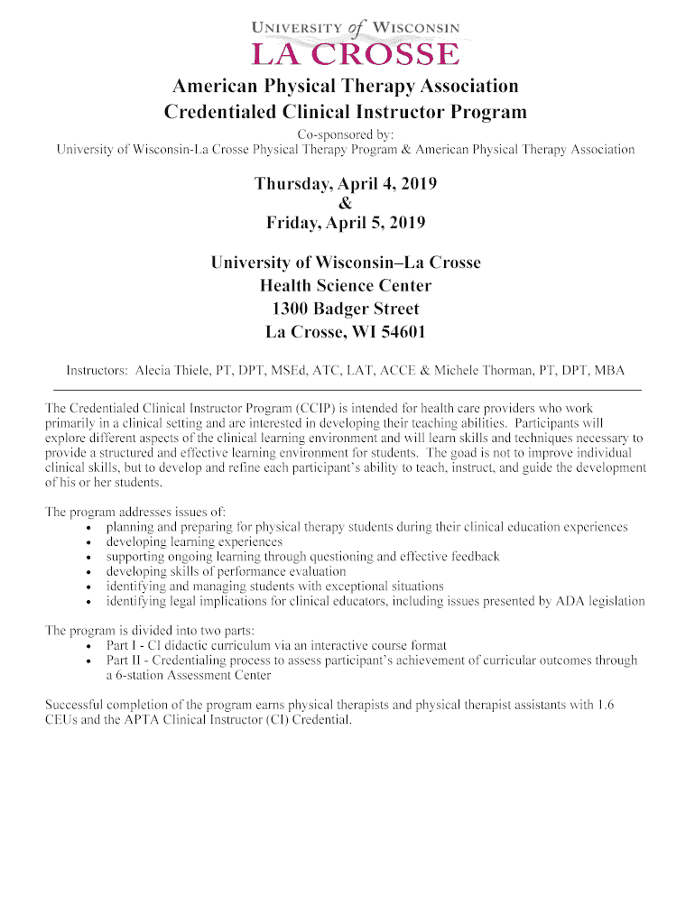 American Physical Therapy Association Credentialed Clinical Instructor Program Cosponsored by: University of Wisconsin La Cross Physical Therapy Program & American Physical Therapy Association Thursday,