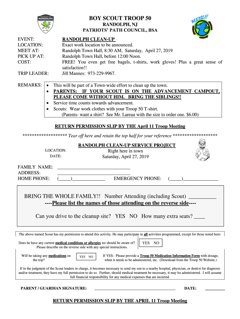 BOY SCOUT TROOP 50 RANDOLPH, NJ PATRIOTS PATH COUNCIL, BSA EVENT: LOCATION: MEET AT: PICK UP AT: COST: TRIP LEADER: REMARKS: RANDOLPH CLEANUP Exact work location to be announced. Randolph Town Hall,
