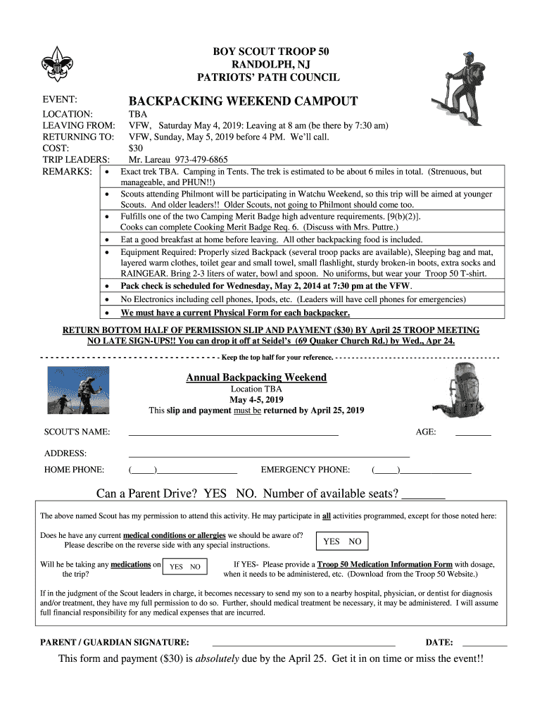 BOY SCOUT TROOP 50 RANDOLPH, NJ PATRIOTS PATH COUNCIL EVENT: BACKPACKING WEEKEND CAMPOUT LOCATION: TBA LEAVING FROM: VFW, Saturday, May 4, 2019: Leaving at 8 am (be there by 7:30 am) RETURNING TO: