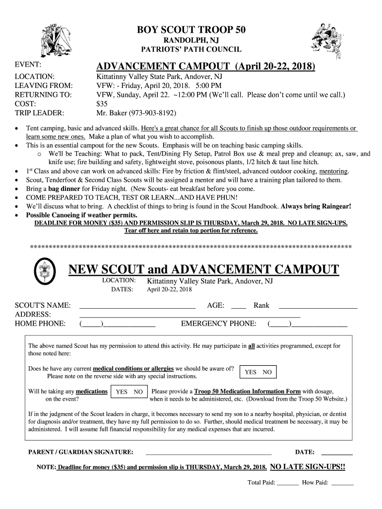 BOY SCOUT TROOP 50 RANDOLPH, NJ PATRIOTS PATH COUNCIL EVENT:ADVANCEMENT CAMPOUT (April 2022, 2018)LOCATION: LEAVING FROM: RETURNING TO: COST: TRIP LEADER:Kittatinny Valley State Park, Andover, NJ